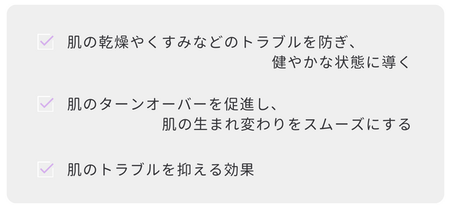 肌の外側のケアでは、肌本来の力を高める成分を配合した、優しい使い心地のアイテムを使用します。力を入れずに、肌を労わりながらケアすることで、肌の乾燥やくすみなどのトラブルを防ぎ、健やかな状態に導きます。
